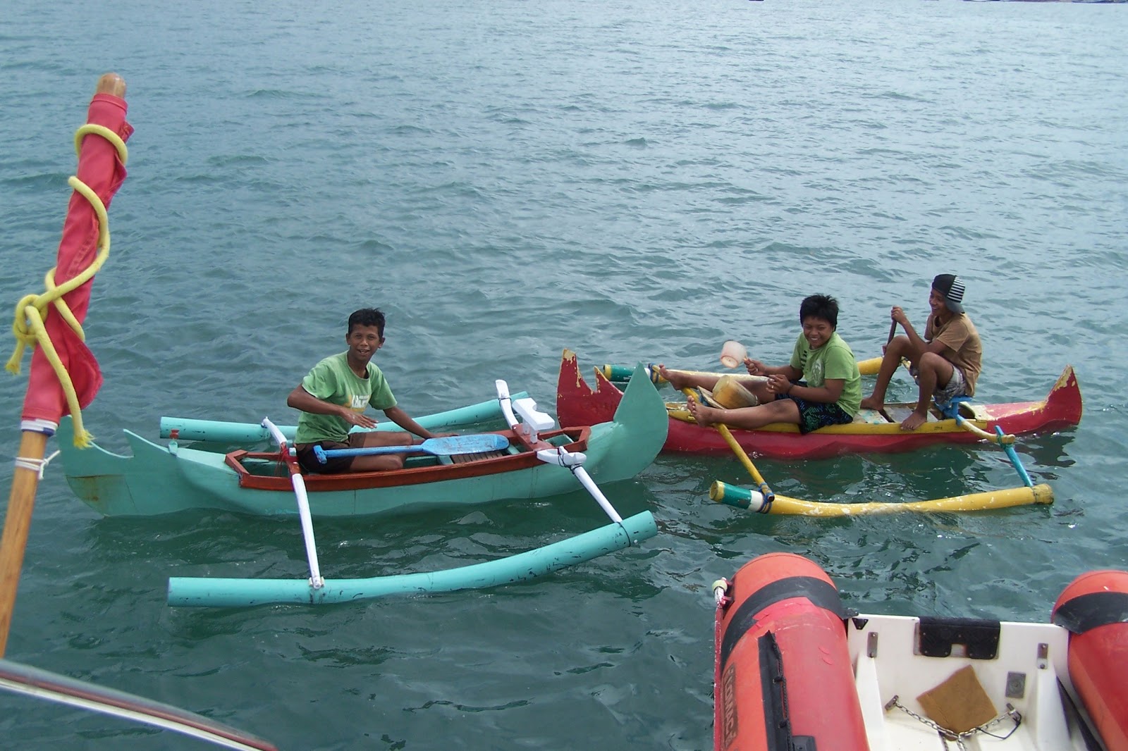 Siamo ancorati davanti all' abitato di TAMBAK e anche qui si sentono le litanie del muezzin. In effetti, nella sortita al paese questa mattina, si vedevano molte donne con il velo ma non tutte. Tutte pero'ci lanciavano occhiate incuriosite e infuocate, per via della primordiale legge della variabilita' genetica. Tambak e' stata una vera sorpresa: scesi con il gommone e percorsi alcuni vicoli bui e stretti ci siamo trovati all' improvviso nel caos vociante da souk arabo della via principale. Stipata all' inverosimile di moto, pullmini, pedoni, riscio' a pedali - il taxi locale - tutti compressi tra due ali di ogni sorta di mercanzie su banchetti, sgabelli, per terra. Ma la novita' non era tanto questo mercatone - ne abbiamo visti altri - quanto noi per loro. Due bianchi barbuti e baffuti, cosi' diversi, arrivati con quella strana astronave che galleggia la fuori tra i loro prahos...-who are you from ?- Italia. Cos' e' ? Dov' e' ? Alieni.